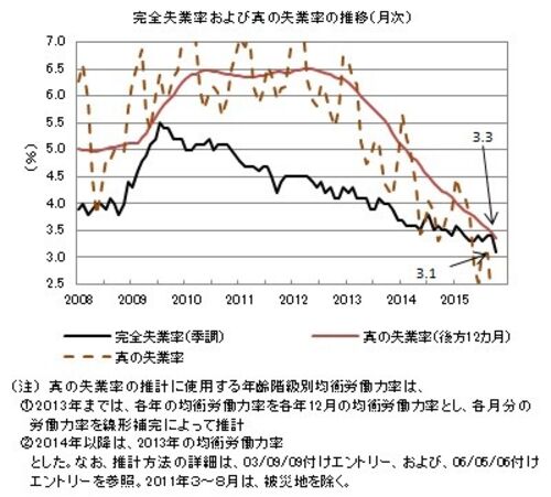 完全失業率によって雇用情勢を判断する場合、不況時に就業意欲を喪失し労働市場から退出する者が発生することで、完全失業率が低下し、雇用情勢の悪化を過小評価することがある。この効果(就業意欲喪失効果)を補正し、完全失業率とは異なる方法で推計した…